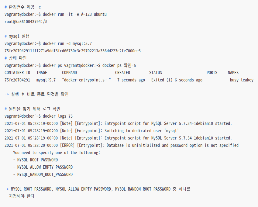 vagrant@docker:~$ docker run -d -e "MYSQL_ROOT_PASSWORD=0525" mysql:5.7