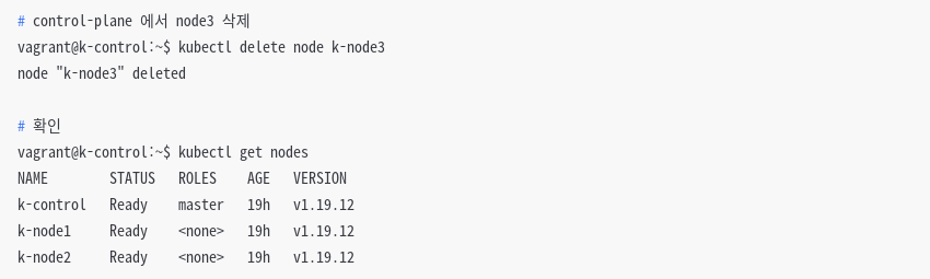 vagrant@k-control:~$ kubectl delete node k-node3