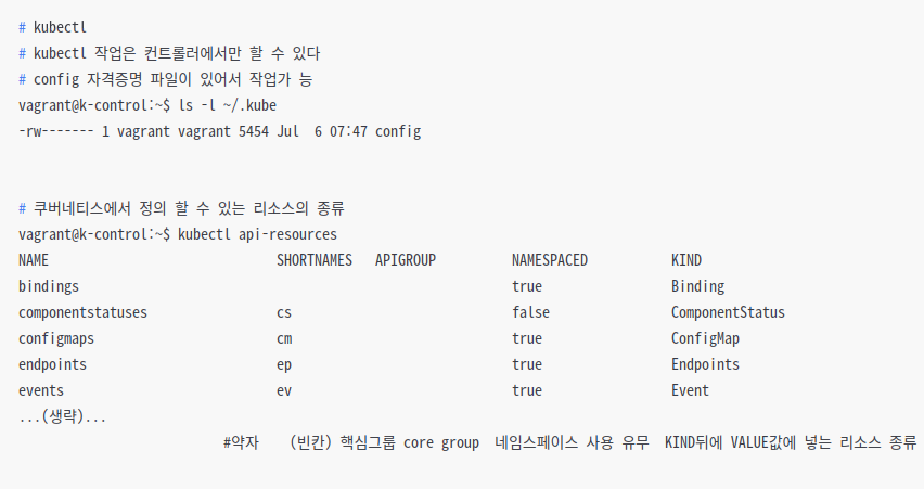 #약자 (빈칸) 핵심그룹 core group 네임스페이스 사용 유무 KIND뒤에 VALUE값에 넣는 리소스 종류