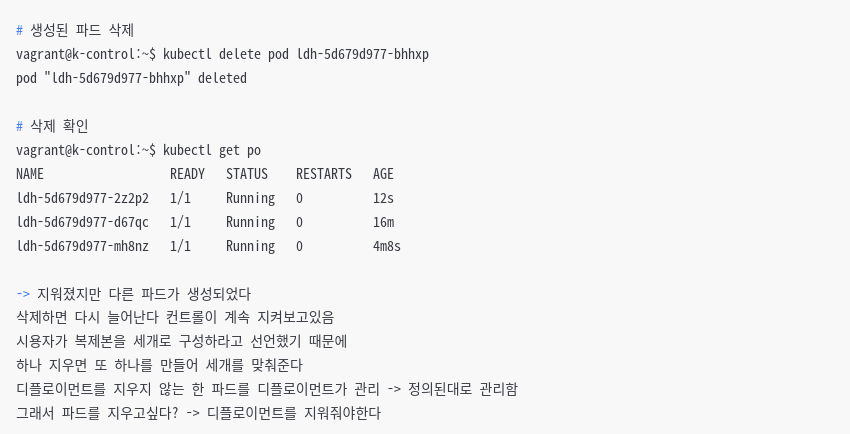디플로이먼트를 지우지 않는 한 파드를 디플로이먼트가 관리 -> 정의된대로 관리함