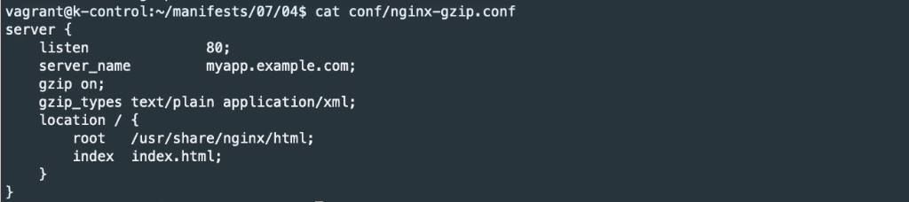 conf 디렉토리에 ConfigMap에 등록 할 Nginx 설정파일인 nginx-gzip.conf 생성