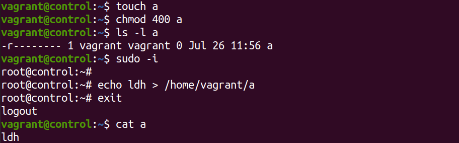 파일 권한을 소유자만 읽을수 있게 만들었는데, 루트권한으로 a라는 파일이 써진다.
