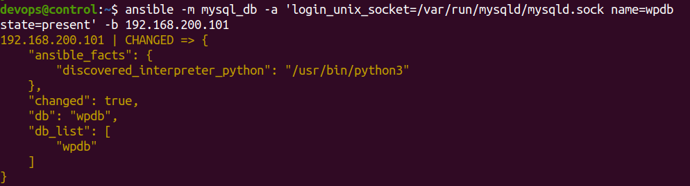 ansible -m mysql_db -a 'login_unix_socket=/var/run/mysqld/mysqld.sock name=wpdb state=present' -b 192.168.200.101