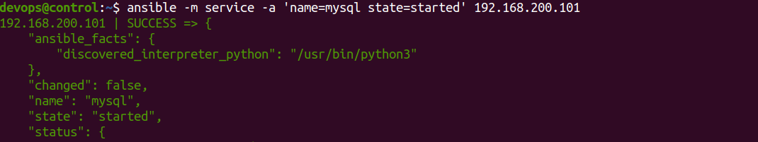 ansible -m service -a 'name=mysql state=started' 192.168.200.101
