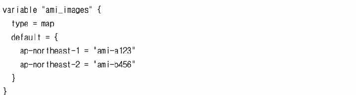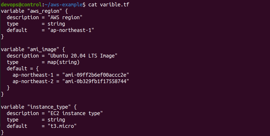 리전 정보, AMI 이미지 등 정보를 Terraform 구성파일 자체에 하드 코딩하는 방식은 Terraform구성파일의 재사용성, 팀 형태의 공유, Git 등의 버전 제어에 적합하지 않다. 따라서 변경 가능한 구성을 변수화 하는것이 좋다.