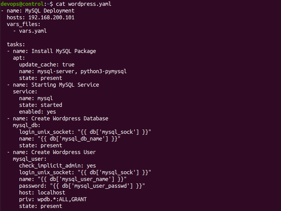 wpdeploy.yaml 더보기 - name: MySQL Deployment hosts: 192.168.200.102 tasks: - name: Install MySQL Package apt: update_cache: true name: mysql-..