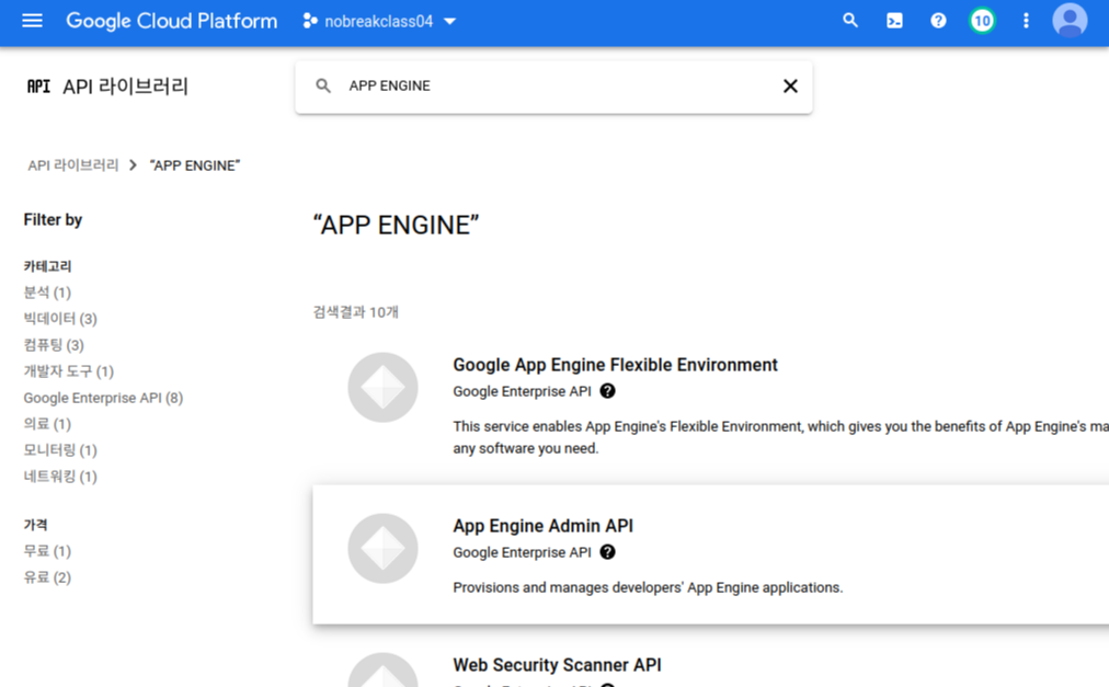 탐색 메뉴 > API 및 서비스 > 라이브러리 > app engine 검색 : App Engine Admin API 선택> 사용 클릭 (활성화)