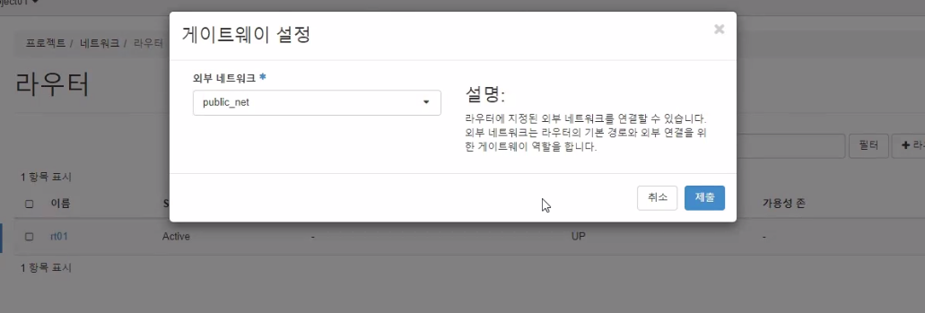 - 라우터에 게이트웨이 설정 (외부네트워크)