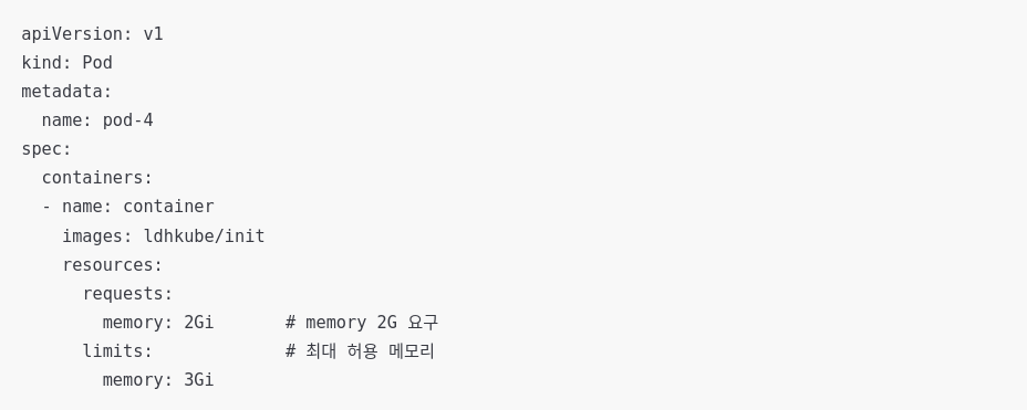 memory의 경우 limits를 넘어버리면 바로 파드를 종료시킨다. 반면 cpu의경우 limits를 넘으면 request 수치까지 낮추고 파드는 종료시키지는 않는다. memory와 cpu가 다르게 동작하는 이유는 각 자원에 대한 특성 때문이다. 예를 들어 파일을 복사할때 하나를 복사하고있는데 또다를 하나를 복사하면 첫번째 파일이 느려지면서 두번째 파일이 복사된다. 프로세스들이 cpu자원을 사용하는데에 있어 서로 문제를 일으키지 않는다. 파일을 복사하는데 두번째 파일이 첫번쨰 파일이 쓰는 메모리를 침범했을때는 프로세스간에 치명적인 문제를 일으킨다.