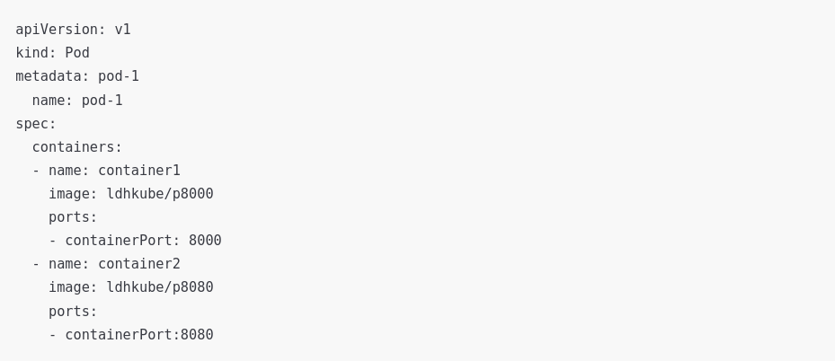 파드안에는 하나의 독립적인 서비스를 구동할 수 있는 컨테이너들이 있다. 그 컨테이너들은 서비스가 연결될 수 있도록 포트를 가지고 있는데 한 컨테이너가 포트를 하나 이상 가질 수 있지만 한 파드내에서 컨테이너들끼리 포트가 중복될 수 없다. 이 두 컨테이너는 한 호스트로 묶여있다. Container1 에서 Container2로 접근할 때 localhost:8080으로 접근 가능하다.