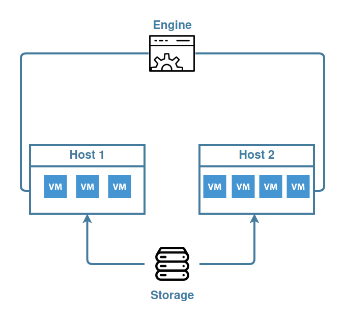 호스트에서는 엔진과의 통신을 담당하는 VDSM(Virtual Desktop Server Manager)을 통해서 위에 올려져 있는 가상머신을 실행하고, 스토리지에서는 VM에서 사용하기 위한 디스크와 이미지 파일, iso 파일등에 접근할 수 있도록하는 저장소 기능을 제공한다.