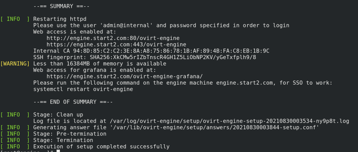 여기까지 설치가 진행되면 웹브라우저에서 oVirt 콘솔에 접속할 수 있게 된다.