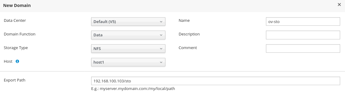 다음으로 오버트 콘솔에서 스토리지 노드를 생성한다. 스토리지 노드 생성 시, 연결할 data center와 host 노드, 스토리지 서버의 ip주소와 마운트할 디렉토리 경로를 입력한다.