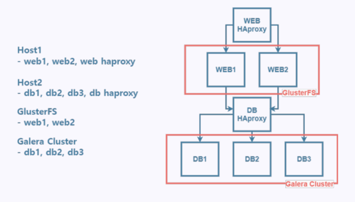 DB 3대는 갈레라 클러스터로, 웹 2대는 GlusterFS로 묶어 데이터를 동기화하고, DB와 WEB 사이에 HA프록시 서버를 두어 DB의 데이터를 워드프레스에 연결되도록 하여 서비스의 중단을 최소화 하기위한 고가용성을 확보했다.