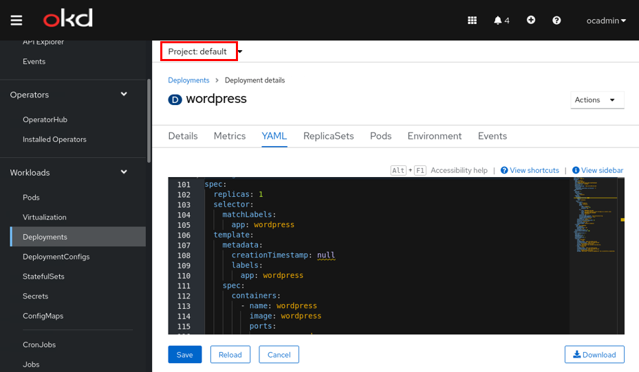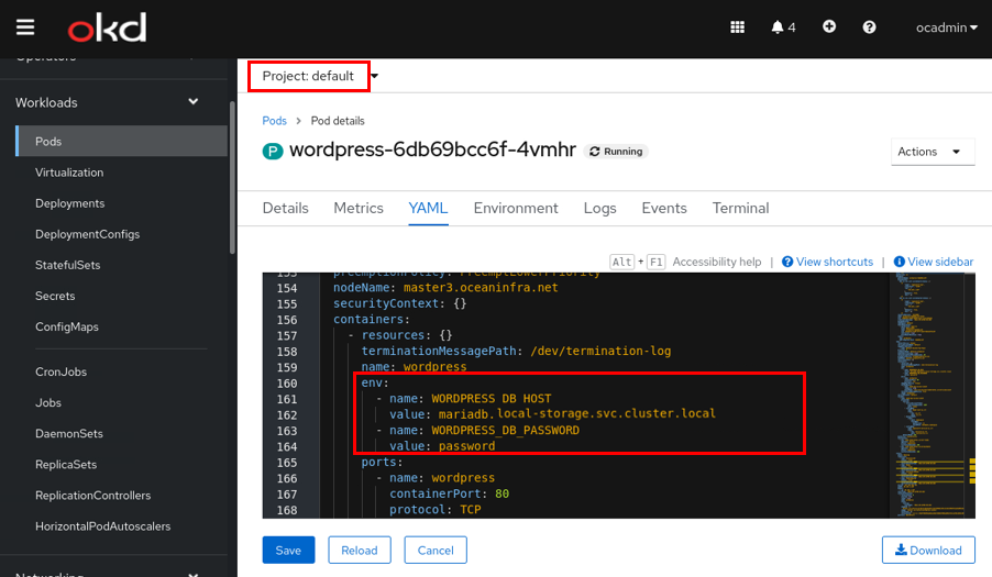그러면 1개의 워드프레스 파드가 생성된 것을 볼 수 있다. 생성된 파드의 YAML의 컨테이너 환경 변수에는 연결할 DB HOST와 PASSWORD를 해주어야 한다. 이때 DB HOST는 local-storage의 mariaDB 서비스의 FQDN을 입력해준다.