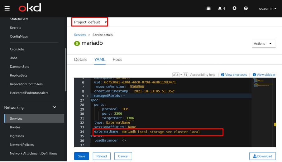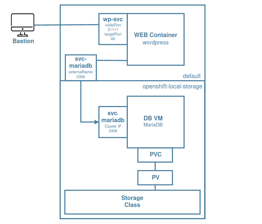 마이그레이션한 DB VM은 local-storage 네임스페이스에 존재하고, OKD에서 생성한 웹 컨테이너는 default 네임스페이스에 존재한다. 이렇게 네임스페이스가 다르면 둘을 연결할 수가 없다는 문제가 생긴다. 따라서 default 네임스페이스에 mariaDB 서비스를 하나 더 생성하여 externalName으로 local-storage에 있는 mariaDB 서비스와 연결될 수 있도록 구성했다. 즉, 사용자가 워드프레스 서비스인 wp-svc에 NodePort를 통해 접속을 하면, default의 mairaDB 서비스가 externalName을 통해 실제 DB-VM이 있는 네임스페이스의 서비스로 연결되어, 웹 컨테이너와 DB VM을 연동시킬 수 있다.