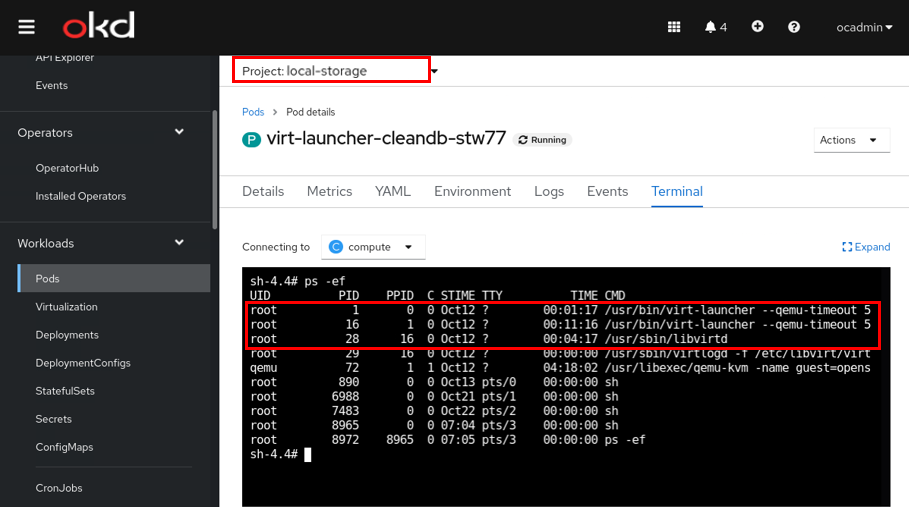마이그레이션한 DB VM을 실행하면 파드가 생성되고, 그 파드는 이제 db로써 작동하고 있다. VM Pod 내의 프로세스를 확인해보면, libvirt 데몬과 virt-launcher가 떠 있는 것이 확인된다. 현재 DB 파드는 local-storage 네임스페이스에 생성되어 있다.