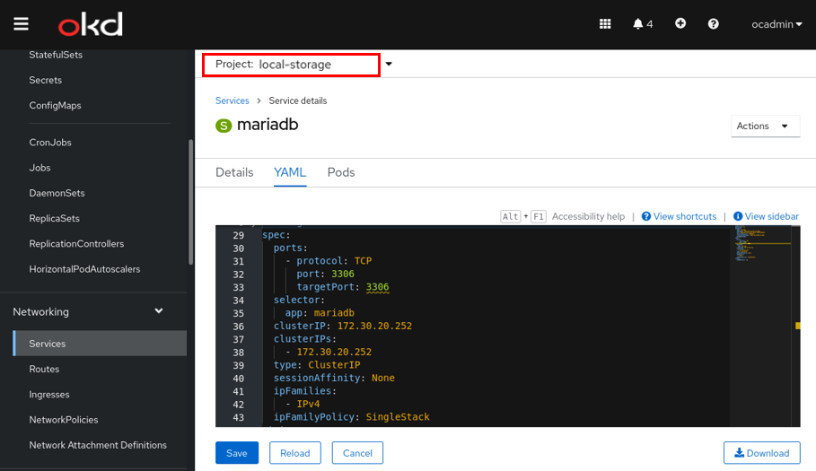 워드프레스 디플로이먼트를 생성하기 전, DB 파드와 같은 네임스페이스에 서비스를 생성해준다. local-storage에서 mariadb 라는 이름으로 서비스를 생성하여, 3306 포트, 타겟포트는 동일하게 3306으로 열어준다.