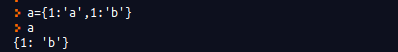 먼저 딕셔너리에서 Key는 고유한 값이므로 중복되는 Key 값을 설정해 놓으면 하나를 제외한 나머지 것들이 모두 무시된다는 점을 주의해야 한다. 다음 예에서 볼 수 있듯이 동일한 Key가 2개 존재할 경우 1:'a' 쌍이 무시된다.