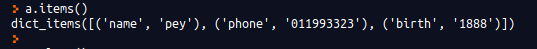 items 함수는 Key와 Value의 쌍을 튜플로 묶은 값을 dict_items 객체로 돌려준다. dict_values 객체와 dict_items 객체 역시 dict_keys 객체와 마찬가지로 리스트를 사용하는 것과 동일하게 사용할 수 있다.